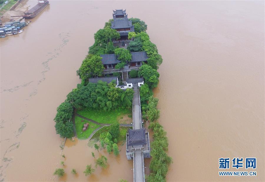 这是7月2日航拍的洪水围绕的湖南衡阳石鼓书院。受连日强降雨影响,湘江湖南衡阳段水位快速上涨,湖南衡阳城区部分地段积水严重。 新华社发(曹正平 摄)