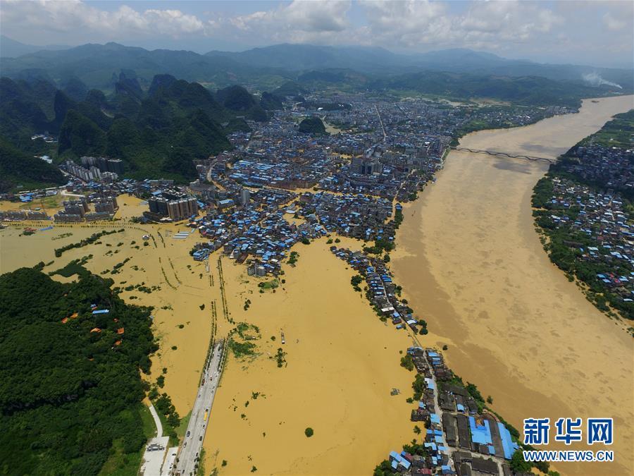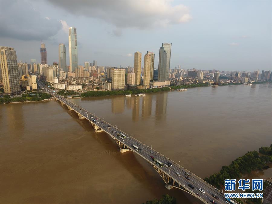 超高水位将长沙橘子洲大桥桥墩几乎淹没(7月2日摄)。7月2日下午,湖南省水文水资源勘测局发布洪水红色预警:受强降雨影响,湘江全线继续上涨,预计未来三天内,湘江干流全线将出现接近和超过历史最高水位的洪水。新华社记者 龙弘涛 摄