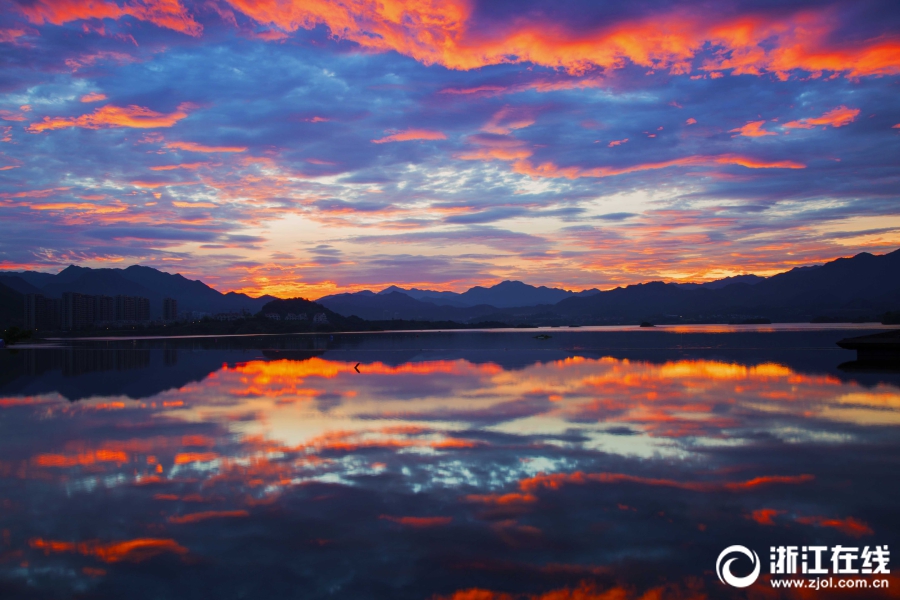 千岛湖的晨景变化莫测。7月9日清晨,千岛湖珍珠广场的朝霞红透半边天,加上水中的倒景,绝美!(浙江在线拍友 方长军 摄)