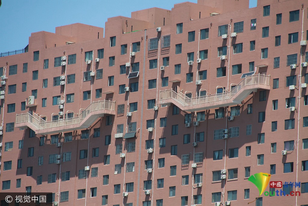 2017年7月10日,在山东济南北园大街上,一幢大楼四个楼梯半悬在50米高的空中。