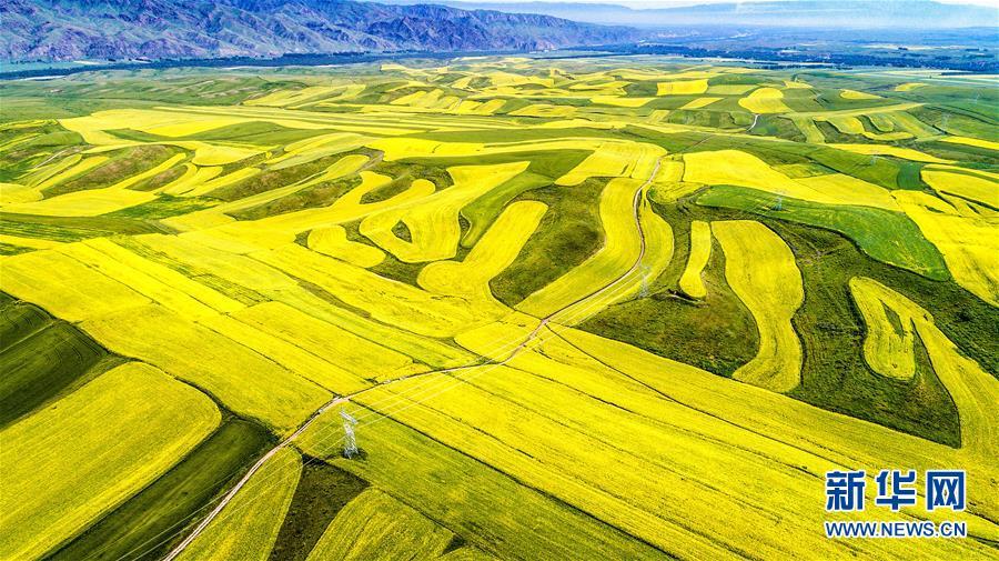 7月9日,新疆伊犁特克斯县阔克铁热克乡的油菜花和绿色的小麦田相互交错,构成一幅色彩斑斓的大地画卷。特克斯县今年种植油菜花近20万亩,进入7月,油菜花竞相怒放,吸引了各地游客慕名前来。 新华社发(刘灵波 摄)