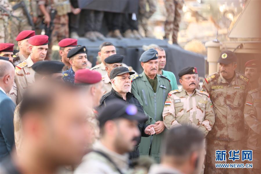 7月10日,伊拉克总理阿巴迪(中)在摩苏尔举行的庆祝仪式上讲话。伊拉克总理阿巴迪10日在位于摩苏尔前线的反恐部队指挥部宣布,极端组织“伊斯兰国”在摩苏尔的统治已被彻底推翻,这个城市于当天全面解放。伊拉克政府军2016年10月发起收复摩苏尔的攻势,今年1月收复东部城区,2月发起收复西部城区的军事行动。今年6月18日,伊拉克政府军从多个方向攻入“伊斯兰国”在摩苏尔的最后据点西部老城。新华社发(哈利勒-达伍德 摄)