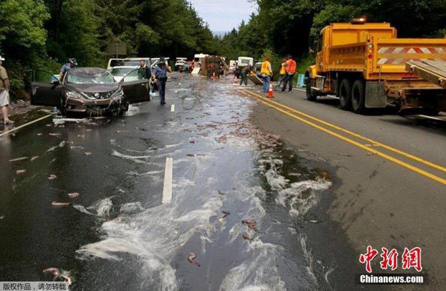 原标题:美俄勒冈一海鲜货车翻车 鳗鱼洒满高速路