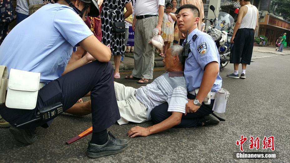 7月18日,四川自贡一名老人被摩托车撞倒,正在该路段巡逻执勤的交警李翰林发现后,立即前住事故地点,发现老人受伤躺在地上。中新社记者 钟欣 摄