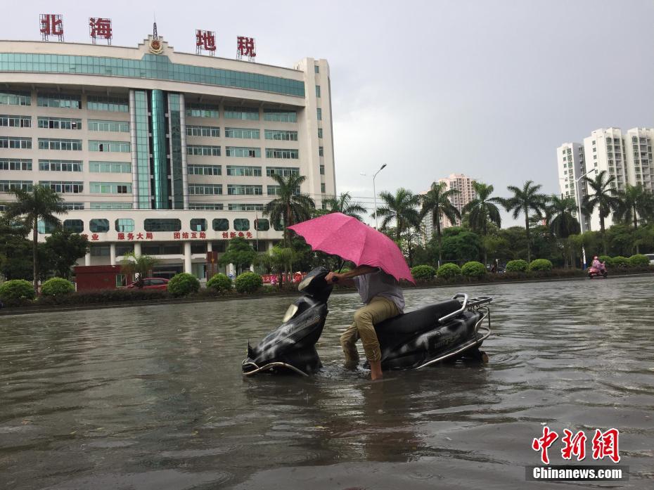 7月19日,广西北海市突降暴雨,部分道路严重积水,路面被淹,民众趟水而过。中新社记者 翟李强 摄