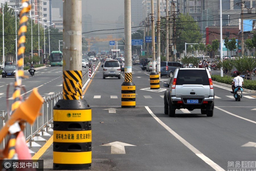 2017年7月17日,郑州,桐柏路一段百余米的车道中间杵着8根电线杆,时刻考验着过往司机的技术。