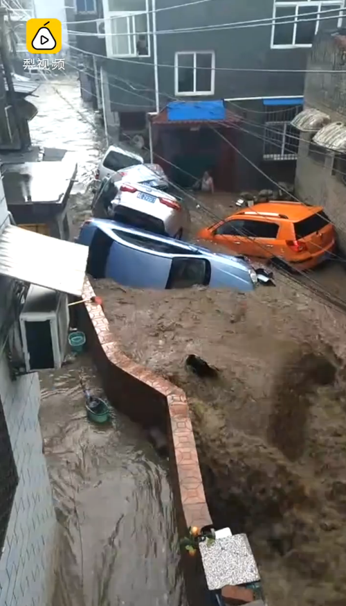 7月18日,山西阳城,突发暴雨,山洪泛滥,轿车被山洪冲得乱转,损失惨重。
