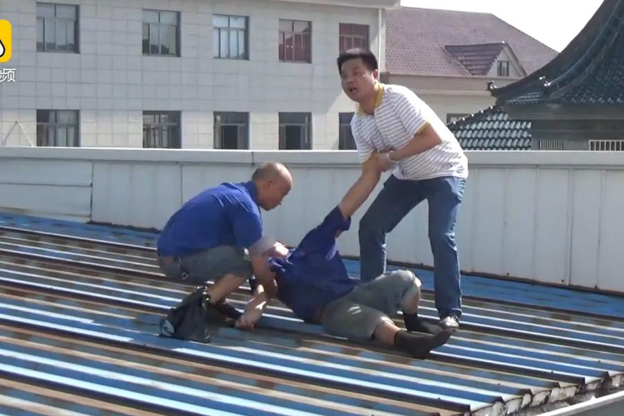 7月20日,浙江宁波,一男子坐15米工厂厂房楼顶,欲跳楼自杀,称老板未给补助。消防、警察赶往现场。一小时协商后,男子拿到钱,支撑不住晕倒。来源:梨视频