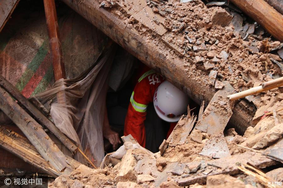 2017年7月20日,广西蒙山县北楼村,因连日降雨,一泥瓦房发生倒塌,2名独居的90岁高龄老人被埋在废墟里。当地消防官兵迅速赶到,徒手将两位老人从废墟里刨了出来,由于救援及时,两位老人奇迹生还。黎侦 冼礼宁/视觉中国
