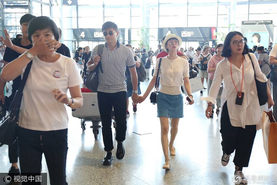 2017年7月23日,上海,刘诗诗、吴奇隆现身机场遭遇粉丝和媒体的围攻,吴奇隆为娇妻打头阵在前面开路,刘诗诗小鸟依人般跟在老公身后,还伸手示意记者不要拍。