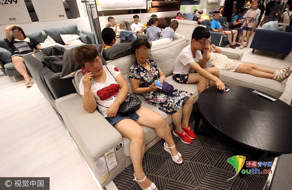 2017年7月23日,持续高温的南京最高温度达到40℃,又是周末,宜家商场涌入“纳凉大军”,人满为患,商场三层的沙发区、书桌区、床品区、样板间、儿童区等有座位的展区,到处都是“葛优躺”,一家人、对对情侣或三五好友,来此享受清凉。