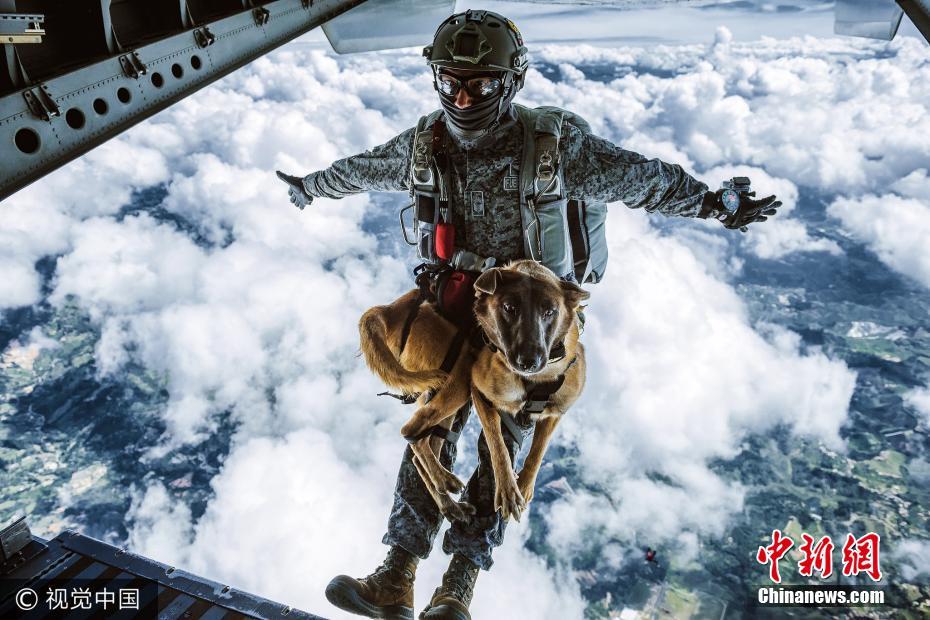 2017年7月25日消息,摄影师奥利弗近日跟拍哥伦比亚空军的搜救训练,在1.4万英尺(约合4300米)高空拍下了军犬夏拉跳伞的罕见画面。夏拉当天戴着特制的装备,在技术员卡洛斯的带领下从高空一跃而下,场面惊险又酷炫。夏拉是一只一岁大的比利时马林诺斯牧羊犬,它刚几天大就开始接受训练,以应对日夜不同环境下的紧张局势,即使在跳伞的过程中它也非常平静,就跟其他狗坐车出去兜个风没什么两样。而已服役24年的哥伦比亚空军首席技术员卡洛斯是一名专业的战斗搜索和救援(CSAR)伞兵,此次他全权负责训练夏拉的第五跳也是它的最后一跳。图片来源:视觉中国