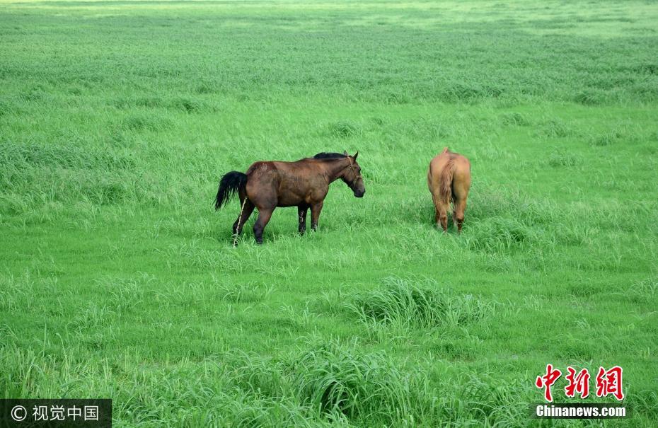 2017年7月24日,流经山东省潍坊寿光市的大型河流弥河出现断流,河床裸露出来,河底长满野草,远远望去像“大草原”一般。据了解,因为干涸河底长满野草,河底船只搁浅,似停在大草原上一样,而水深危险严禁游泳的指示牌提醒着人们,这里原来是条河。因为野草丛生,当地人直接在此放牛羊,所以牛羊成群场景很常见,远远望去非常壮观。图片来源:视觉中国