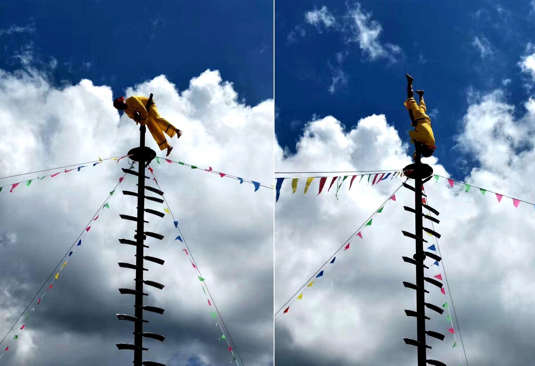 7月21日,四川省万源市境内举行了一场“上刀山、下火海”的傩技表演,傩师们“赤脚上阵”的真功绝招,让每一位在场观众惊心动魄。20多把明晃晃的锋利钢刀从高耸的木杆中交叉穿过,其阵势让不少观众惊出一身冷汗。为进一步验证钢刀的真假,台下观众将塑料绳随机放在几把钢刀上,轻轻一拉就被割断了。