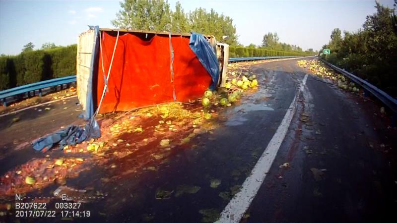 央广网7月24日武汉消息(记者凌姝通讯员周静)7月22日,正值二十四节气中的大暑,在大广高速公路就发生了这么惊险一幕:一位货车司机因行车途中遭遇车辆爆胎,无法控制方向导致车辆发生侧翻,车上运载的7吨西瓜抛洒一地,幸亏事故并未造成人员重伤,未引发二次事故。