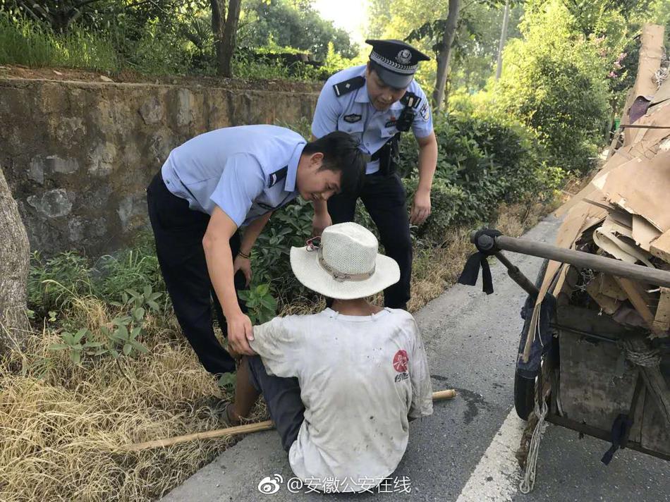 24日,40℃。宁国公安港口派出所民警出警回所途中,发现一老人坐在路边,询问得知老人拉着一车废木料准备回家,因天热而体力不支。民警随之将老人扶上警车并拉起老人的板车,将老人和板车一起送回家。