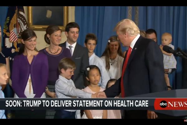 7月27日报道,美国参议院26日针对是否推翻“奥巴马健保”进行表决,特朗普特地在白宫召开记者会。然而,记者会上的一个小插曲惹怒了不少网友,特朗普出场时和身后民众握手时却跳过了两名亚裔小女孩。