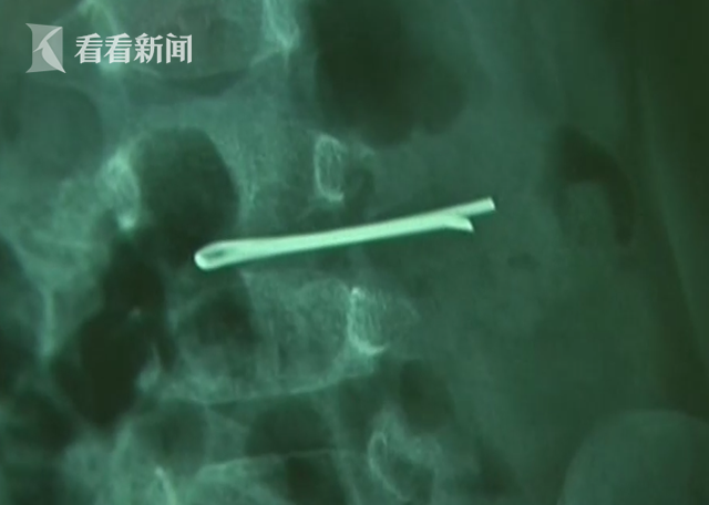 医院给南南拍的胸片从片子上可以清晰看到,南南的胃部有一个亮度很高的物体。从形状看,它是不是很眼熟。对了,这就是南南在睡觉时不慎吞下肚子的发卡。