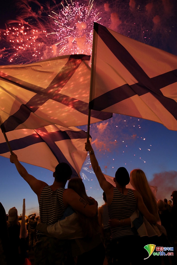 当地时间2017年7月30日,俄罗斯圣彼得堡,民众观看海军日烟花表演。