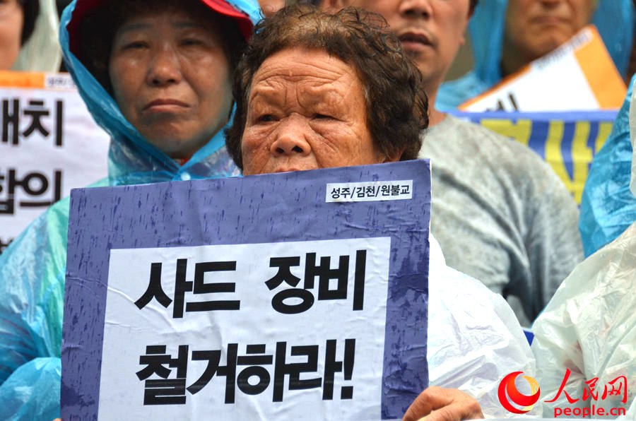 7月31日,韩国反“萨德”市民团体冒雨聚集在总统府青瓦台附近,举行反“萨德”集会,抗议韩国政府追加部署“萨德”发射车的决定。