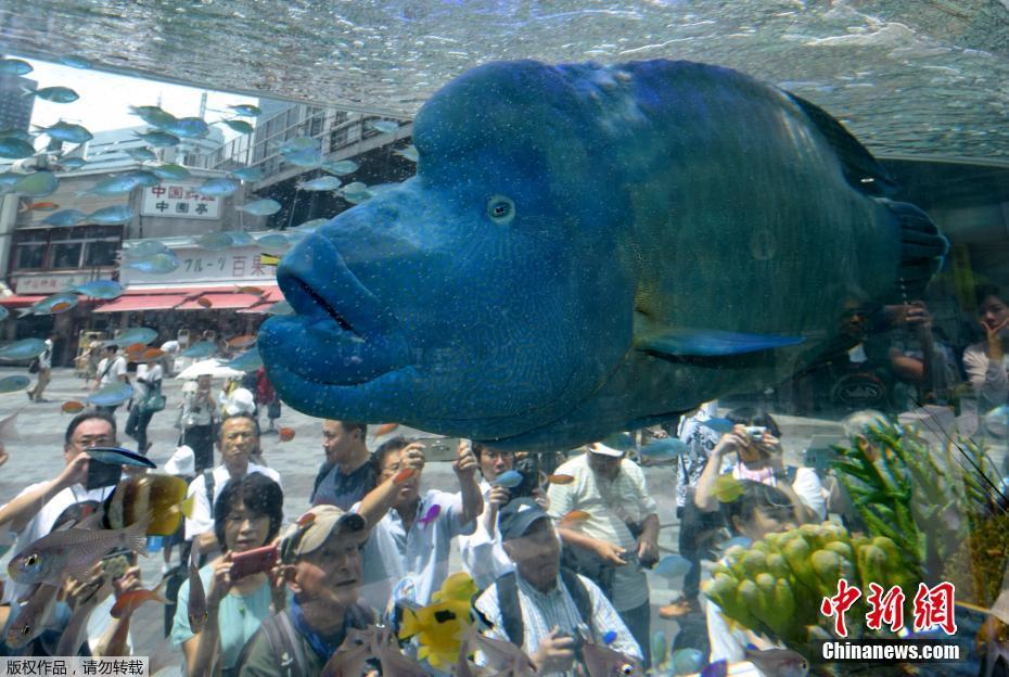 当地时间2017年7月31日,日本东京,主打冲绳海洋生物的2017年索尼水族馆展览举行,一只蓝色的苏眉鱼吸引民众围观。