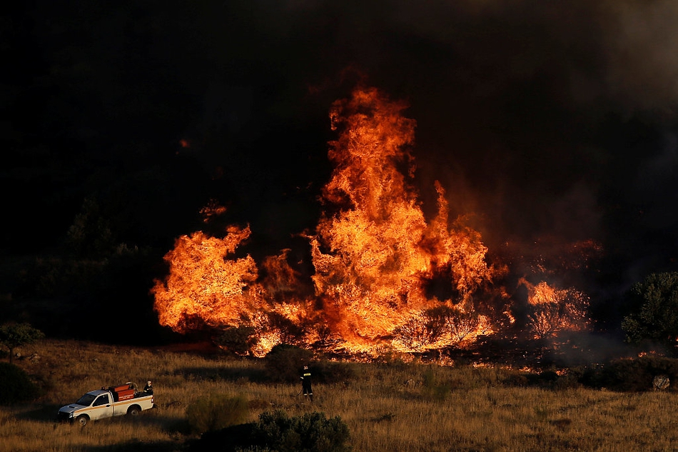 当地时间2017年7月31日,希腊卡利维亚,当地遭山火袭击,消防员参与灭火。