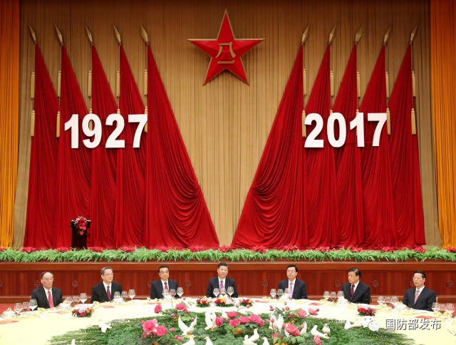 人民大会堂宴会厅灯火辉煌,洋溢着节日的喜庆气氛。主席台帷幕中央悬挂着巨型“八一”军徽,两旁是十面鲜艳的红旗。“1927-2017”几个醒目的大字,昭示着中国人民解放军走过了90年的光辉历程。18时许,在欢快的《迎宾曲》乐曲声中,习近平等党和国家领导人步入宴会大厅,同1800余名中外来宾欢聚一堂。