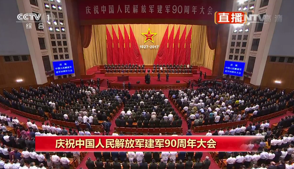 8月1日报道,庆祝中国人民解放军建军90周年大会于1日上午10时在人民大会堂举行。中国国家主席习近平出席大会并发表重要讲话。图为人民大会堂现场。图文:央视新闻 新华网