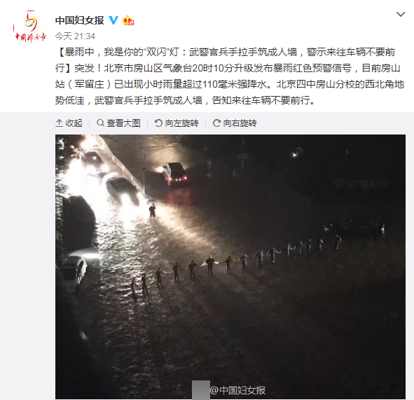 2017年8月2日,北京,一场如期而至的雷阵雨降落京城,北京部分地区街道被淹。北京四中房山分校的西北角地势低洼,武警手拉手筑成人墙,告知来往车辆不要前行。 ???