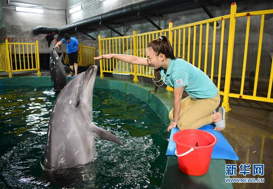 8月2日,海豚驯养师王瑞雪在训练海豚做动作。