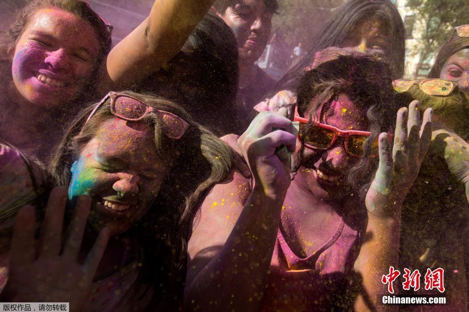 当地时间2017年8月5日,西班牙马德里,洒红节当天,西班牙民众互相喷洒彩粉狂欢庆祝。洒红节又称“胡里节”、“色彩节”,原是印度人民在传统春节时庆祝的印度教节日,人们互相抛洒用花朵制成的红粉,投掷水球,迎接春天的到来。后来逐渐流行到全球很多国家和地区。