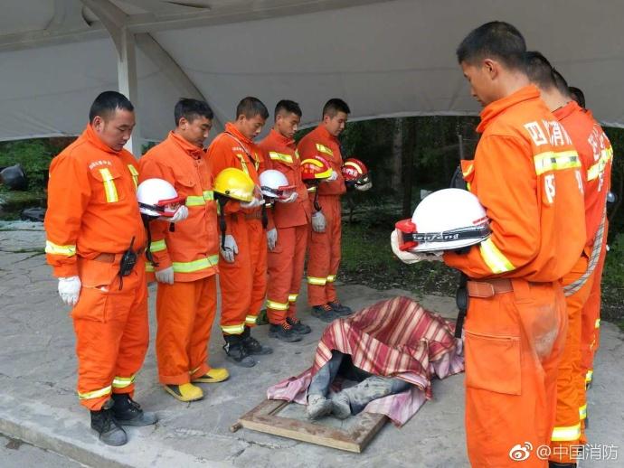 九寨沟震后搜救 消防官兵向遇难者默