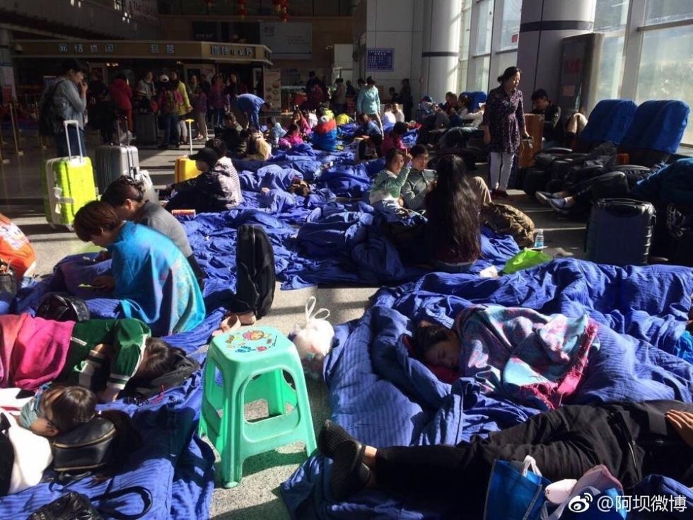 9日上午9点,记者在九寨沟黄龙机场看到数百名游客席地而卧,机场方面已经提供蓝色被子和方便面等基本物资。