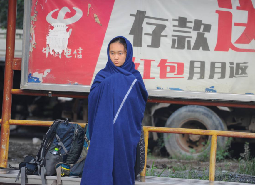 9日上午,九寨沟县老县城九寨大道车辆穿梭,一辆接一辆满载游客的车子从沟口驶来。车流旁站着很多 散客,伸长脖子张望,盼着搭载自己的车到来。游客当中,一位全身裹着毯子的女孩颇为引人注目,旁边一位中年男子用手机拍她的各个动作。这对来自哈尔滨的父女俩在8日经历了人生首次地震,让女孩最感动的是地震瞬间爸爸的一声大喊“别怕,爸爸在呢”。