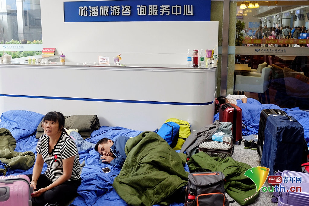 2017年8月9日,四川九寨沟,数百名游客因地震滞留在九寨沟黄龙机场,机场方面已经提供蓝色被子和方便面等基本物资,候机大厅比较温暖,现场秩序比较良好。
