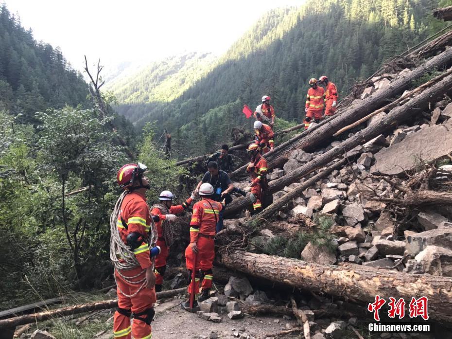 8月9日下午16时左右,德阳消防14名党员突击队员徒步行军10余公里,历时3小时到达洛日朗附近一带搜索被困群众,期间余震不断,大小石头不断的从山上滚下来,救援官兵把生死抛开,寸步难行的在山间搜寻。 图片来源:四川消防供图
