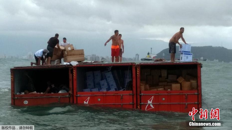 当地时间2017年8月11日,巴西桑托斯,货船集装箱落水。巴西货船"Log-In Pantanal"有45个集装箱落水,这些集装箱里装有电子产品、空调等家用电器、背包、医用品、轮胎、毛巾以及衣物等货物。