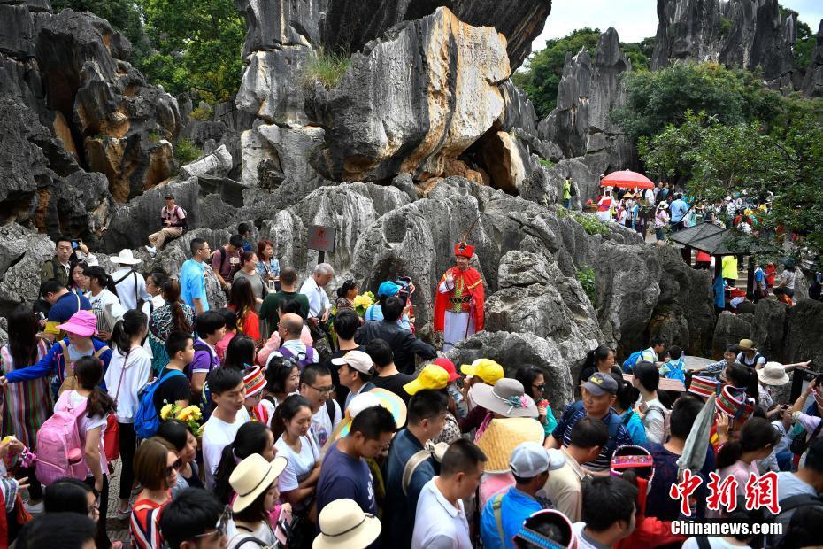 8月13日,一名身着阿黑哥服饰的游客被人流“包围”。暑假期间,云南石林风景区旅游升温,前来游玩的旅客络绎不绝。园区工作人员介绍,暑期每天园区接待游客近3万人。石林景区是著名的世界自然遗产,也是闻名遐迩的中国彝族美丽传说人物——阿诗玛的故乡。