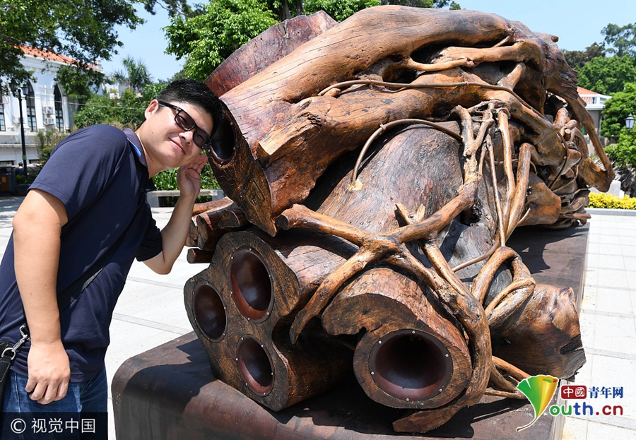 2015年8月15日,厦门,游客在“鼓浪留声”公共艺术装置旁聆听老树的“诉说”。厦门鼓浪屿一棵树龄达210年的榕树,在2016年9月登陆厦门的超强台风“莫兰蒂”侵袭后倒伏死亡,现经再生创作后变身为“鼓浪留声”公共艺术装置,亮相鼓浪屿岛上。据了解,艺术家对古树进行表皮处理后,在树中安装了各种口径大小不同的铜质喇叭,将所采访的老鼓浪屿人、鼓浪屿研究学者、商人等人物的声音,以及收录的大自然各种声音,通过喇叭从古树中传递出来。