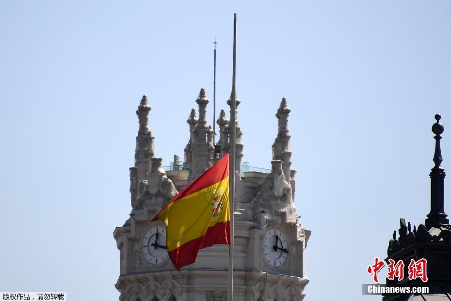 图为西班牙马德里西贝雷斯宫外降半旗。