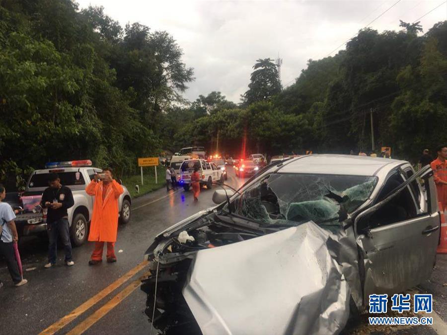 据中国驻清迈总领馆消息,当地时间20日下午4时30分,一辆载有中国游客的旅游面包车在清迈府堆沙革县的省际公路上与一辆皮卡相撞。事故造成11名中国游客受伤,其中5人受伤严重。这是8月20日在泰国清迈府堆沙革县拍摄的事故现场。新华社发