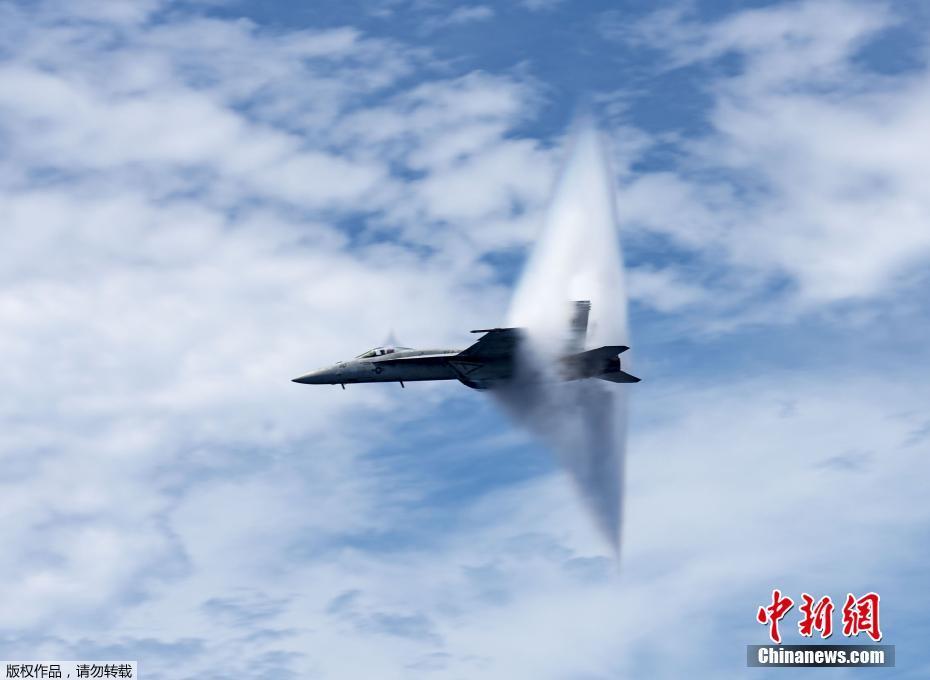 当地时间2017年8月21日,美国军方公布了一张“超级大黄蜂”战斗机突破音障的图片。这架F/A-18E“超级大黄蜂”战机在大西洋上空以超高速飞行时突破音障,在机尾产生了壮观的蒸汽锥。