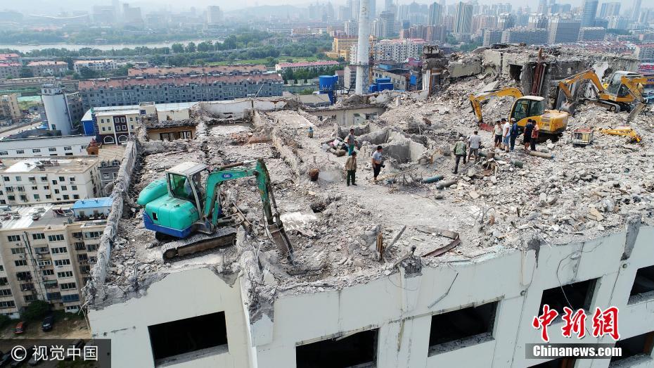 8月21日,在山东济南北园大街南侧的原明湖大酒店拆除现场,数十名施工人员爬上18层顶楼平台施工作业,同时还有四台大型挖掘机进行破拆施工。由于楼顶未设置保护围栏,拆除砖块不时的从楼顶掉落到一层地面,挖掘机施工时距离顶层边缘最近时只有一米,如同踩着悬崖峭壁施工。据了解,明湖大酒店南侧是密集的居民楼,东西两侧是电子市场和家具市场,北侧距离北园高架不足百米,不适合爆破拆除,大型吊车将挖掘机吊到约60米高的楼顶,进行人工逐层拆除。 御宁 摄 图片来源:视觉中国 文字来源:舜网