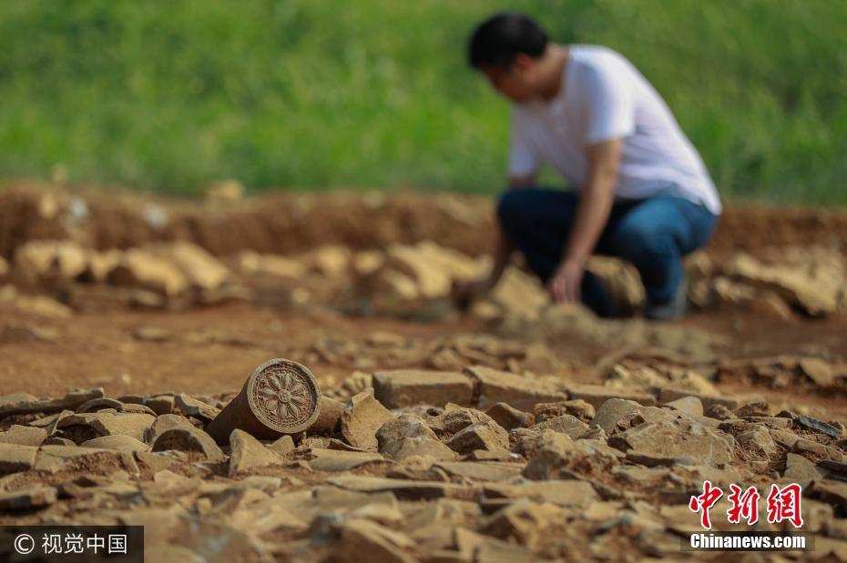 2017年8月22日,江苏淮安,工作人员谭勇在对都梁宫遗址进行考古发掘。近日,江苏省淮安市盱眙县在县城棚户区改造时发现大量跨度千年文物。 周海军 摄 图片来源:视觉中国
