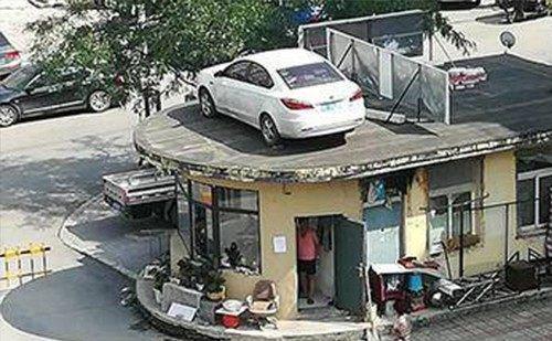 8月22日,辽宁本溪,一辆灰色轿车现身一小区门卫室房顶。知情人透露,这是小区物业雇佣吊车特意吊上去的。来源:辽沈晚报