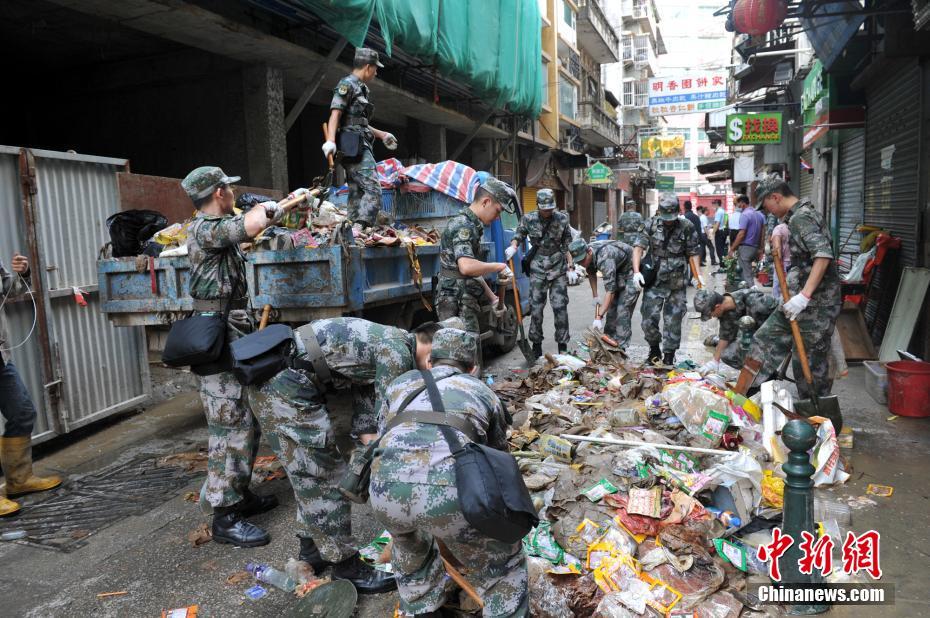 今年第13号台风“天鸽”重创澳门。8月25日,解放军驻澳门部队根据中央军委命令,出动官兵约千人,协助澳门特区政府展开台风“天鸽”灾后救助,保护市民生命财产安全,尽快恢复正常生产生活秩序。图为驻军官兵在十月初五街清理垃圾。 中新社记者 龙土有 摄