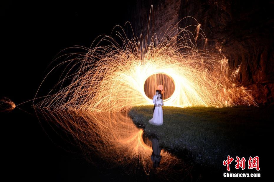 8月25日晚,一对在去年“七夕”相识的情侣来到湖南湄江三道岩门拍起了创意光绘照,情侣在飞溅的火花下相拥,以此纪念即将到来的“七夕”情人节。图为情侣在河边相拥,火花飞溅的倒影与人相融十分震撼。 杨华峰 摄