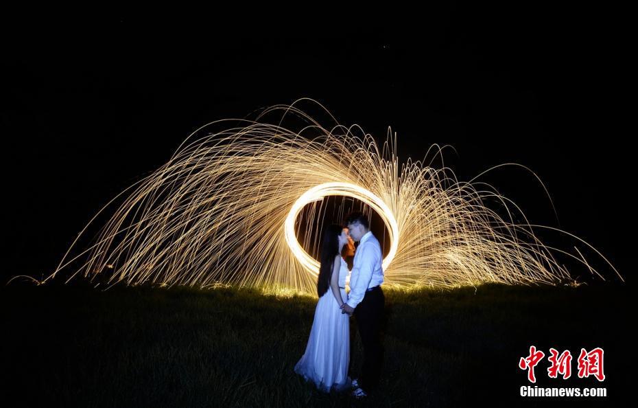 情侣湖南湄江拍创意光绘照迎“七夕”
