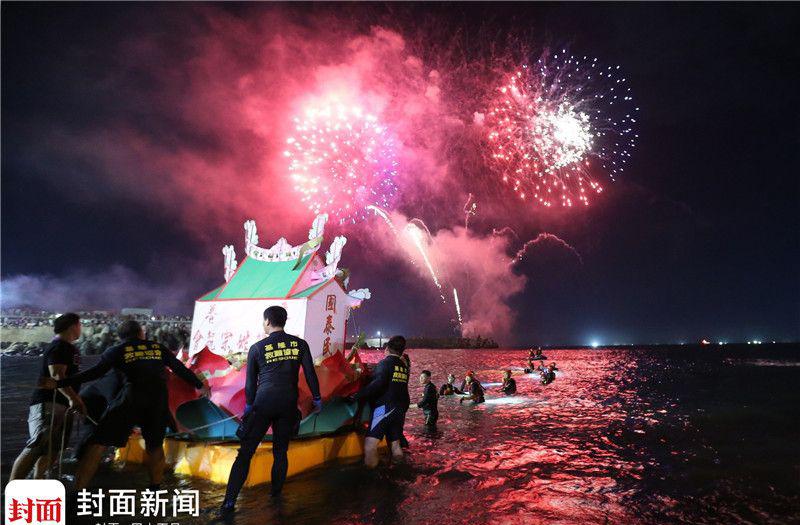 9月4日,中国台湾,一年一度的基隆中元祭晚间热闹登场,水灯头在绕行基隆市区后,子夜在望海巷放水灯,在各宗亲人员将水灯推向海后,燃烧的水灯头随波逐流,流向大海。