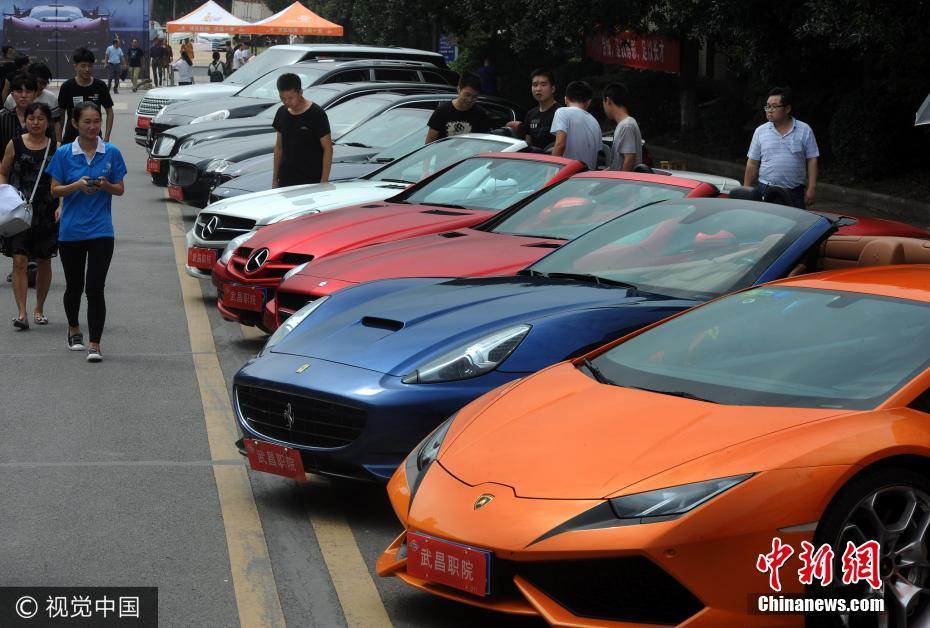 9月5日是武汉一职业学院2017级新生报到第一天。记者在现场看到,各个二级学院为了迎新都使出了浑身解数:旅游学院的老生和年轻教师,穿着空姐制服,给新生和家长送自制手工饼干和贺卡;机电工程学院学生制作的机器人向每位新生和家长“鼓掌”以示欢迎……尤为引人注目的是,校园迎新道路上停放着的法拉利、玛莎拉蒂、路虎、保时捷、奔驰、宝马等十几辆豪车,吸引了前来报到的新生和家长拍照围观。原来,这是该校特色专业班级“豪车班”设置的迎新点,学校花一千多万购买了豪车,用来给学生实训练手。 吴铭 摄 图片来源:视觉中国 文字来源:秦楚网